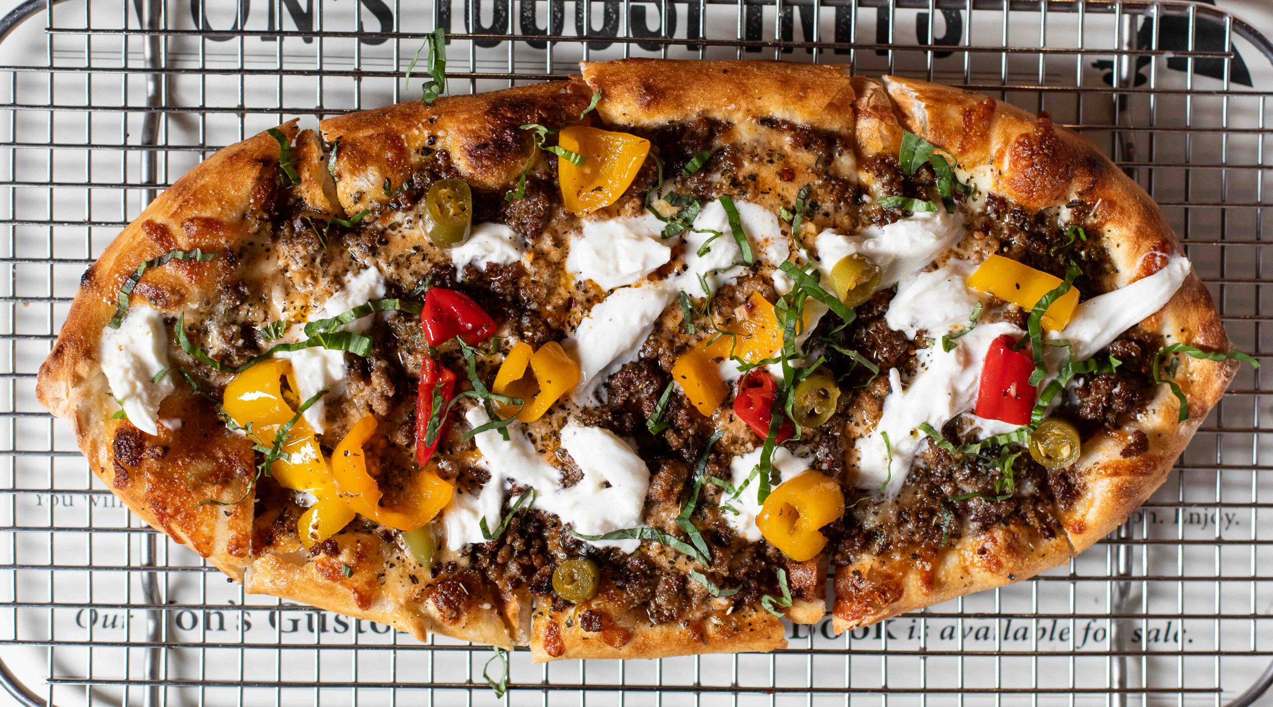 Little pepperonis, whole milk mozz, peppadews, Sicilian spice, Calabrian hot honey, basil.